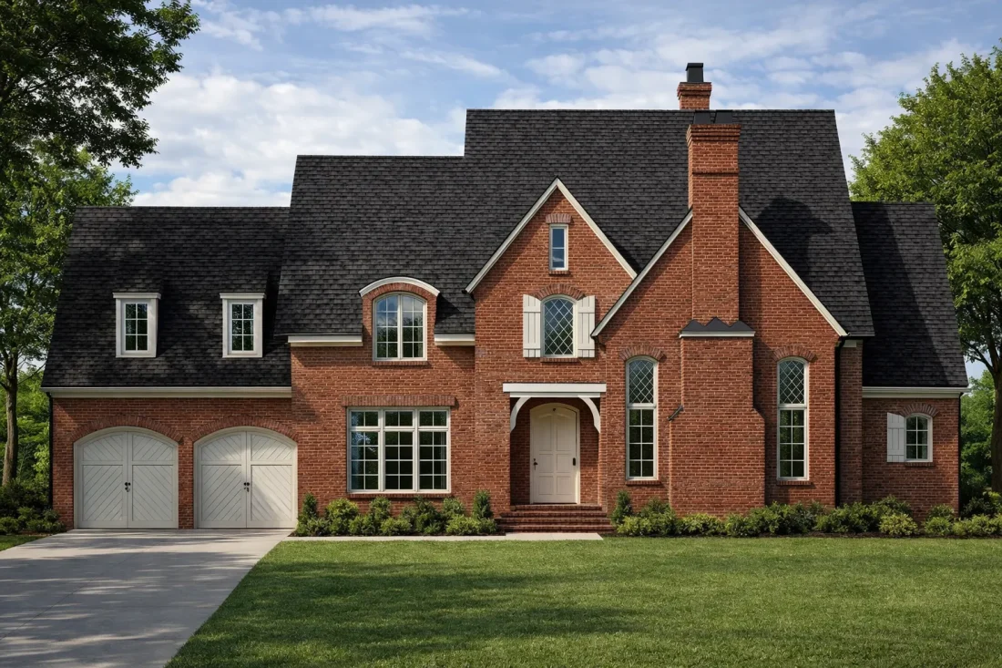 This Tudor Revival style house plan blends classic English character with modern livability. The combination of steep rooflines, arched openings, and brick craftsmanship creates a luxurious yet inviting family home.