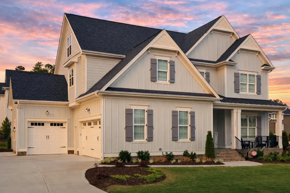 The exterior of this home is defined by crisp board and batten siding, clean rooflines, and a symmetrical façade that reflects classic American design principles. Gabled forms and a covered front porch introduce a distinctly Southern farmhouse influence, while subtle detailing and proportional balance place the home firmly in the New American category.