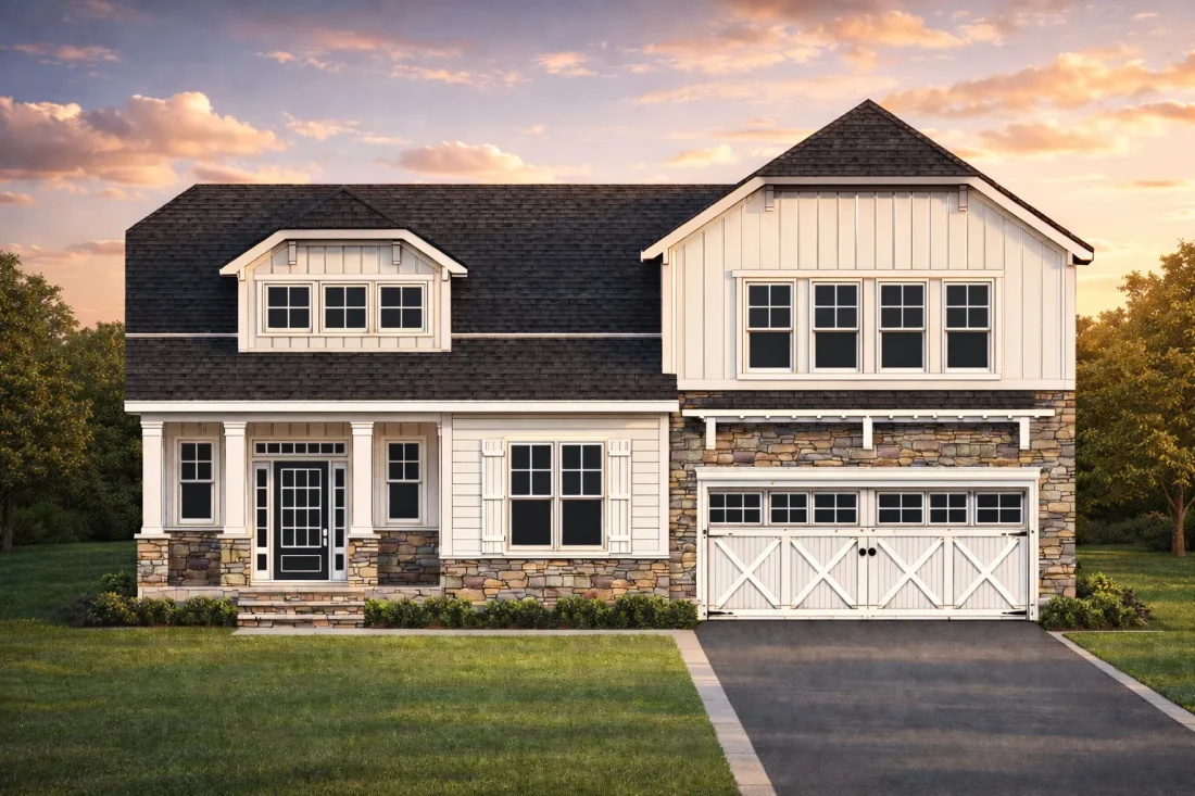 The exterior showcases a refined combination of board and batten siding, horizontal lap siding, and stone veneer accents. These materials are hallmarks of modern farmhouse and New American architecture, providing texture, contrast, and enduring visual appeal. Symmetrical gables, clean trim lines, and a balanced façade reinforce its classic roots while maintaining a fresh, updated presence.