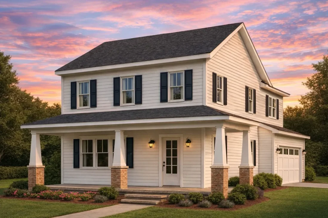 The exterior palette focuses on durability, low maintenance, and classic aesthetics. Horizontal lap siding creates clean lines and reinforces the home’s traditional roots, while brick porch piers add texture and visual grounding at the base of the structure. These materials are widely used across traditional American architecture and remain popular for their proven longevity.