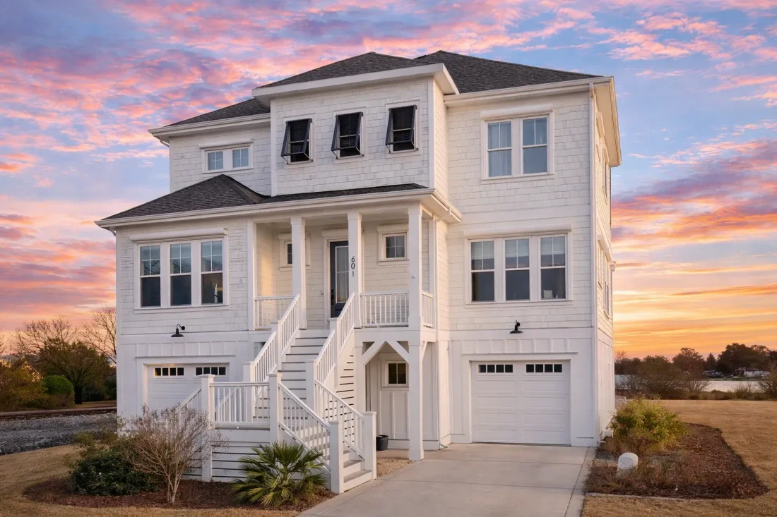 The horizontal lap siding provides durability against salt air while maintaining the timeless aesthetic associated with coastal homes. Clean trim detailing and railings reinforce the home’s Beach House character.