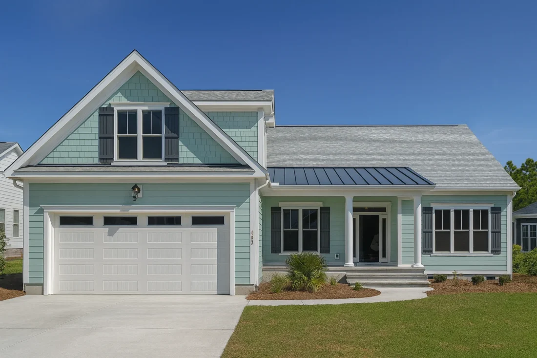The soft pastel exterior—paired with subtle architectural details like shutters, gable returns, and the metal porch roof—creates a signature coastal aesthetic reminiscent of homes found in the Carolinas, Cape Cod, and Nantucket.