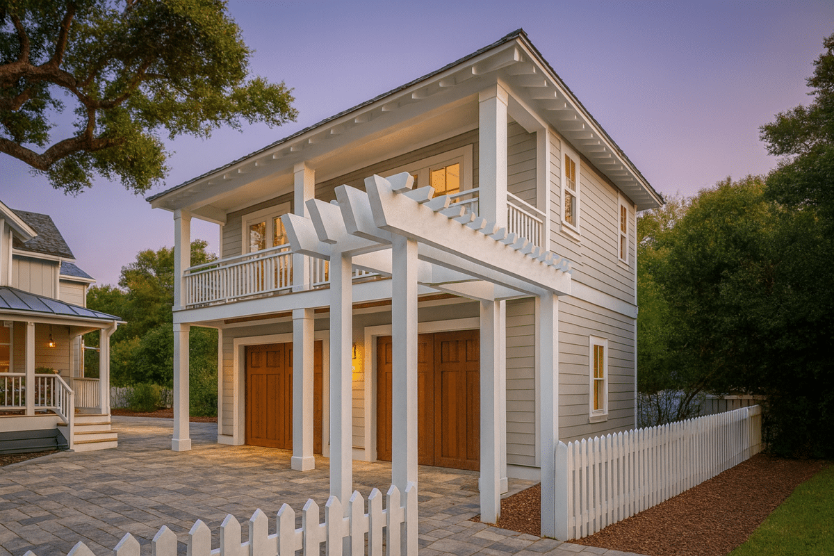 Discover this elegant cottage-style house plan with 429 heated sq. ft., an open layout above a 2-car garage, and coastal-inspired design—includes CAD blueprints and more.
