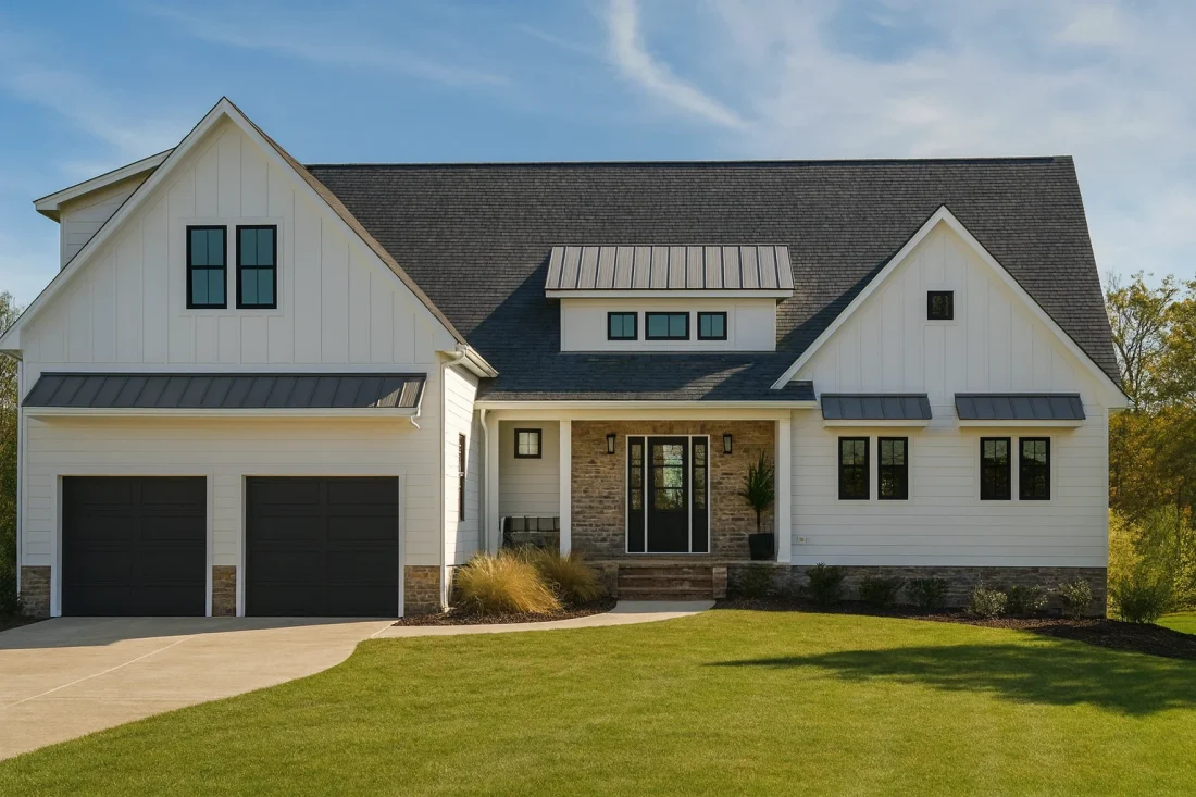 - Board-and-batten siding establishes vertical rhythm and farmhouse authenticity