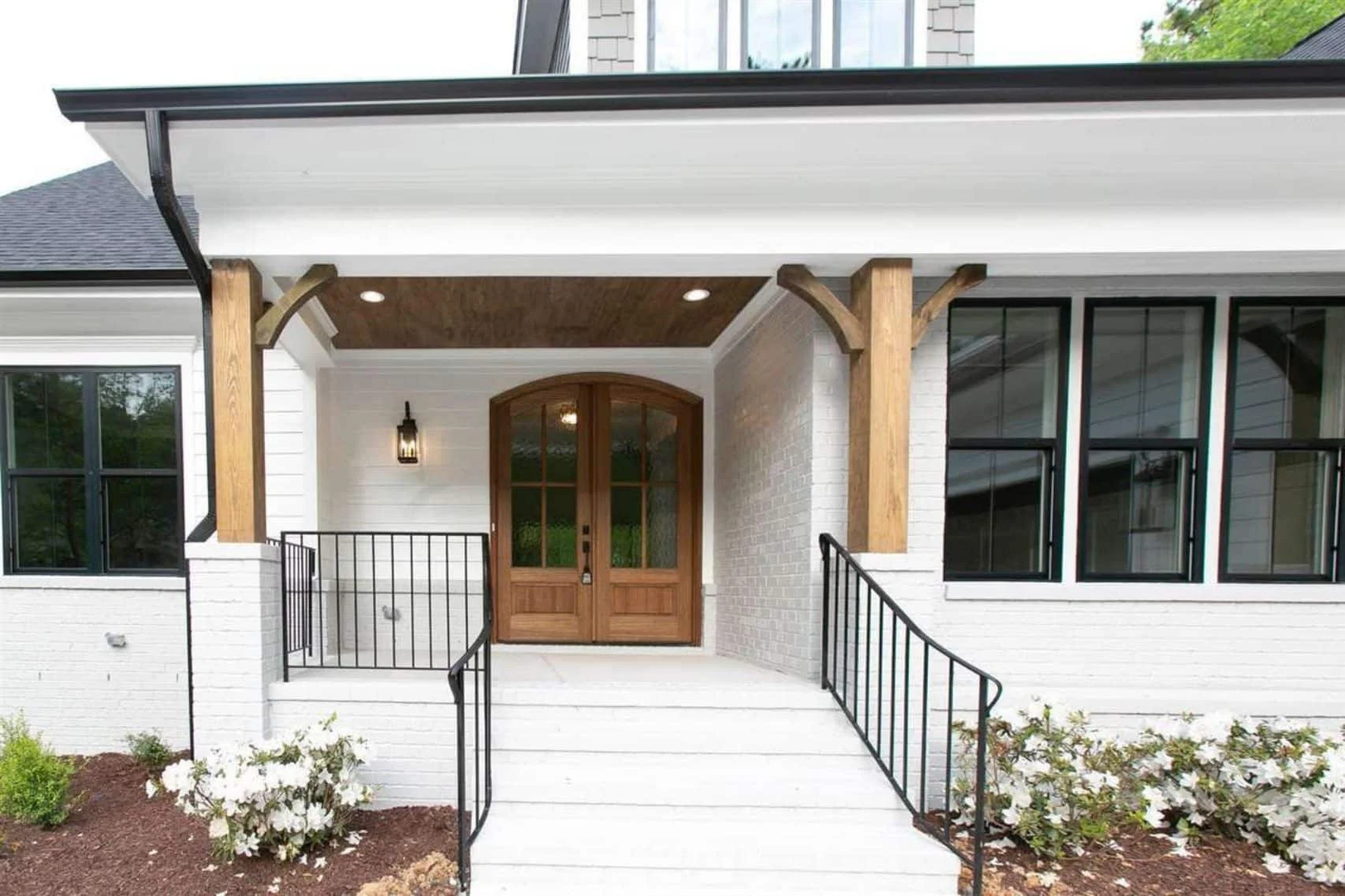 - Craftsman-style curb appeal with detailed columns, exposed rafter tails, and mixed exterior materials.