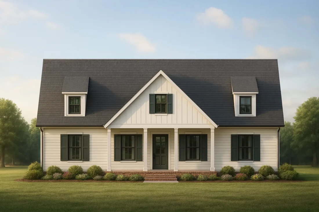 This Modern Farmhouse Cape Cod house plan blends classic coastal charm with contemporary rural simplicity. Featuring a gabled roofline, board and batten siding, and symmetrical dormers, it captures the cozy nostalgia of Cape Cod homes while introducing modern livability and open-plan design for today’s families.