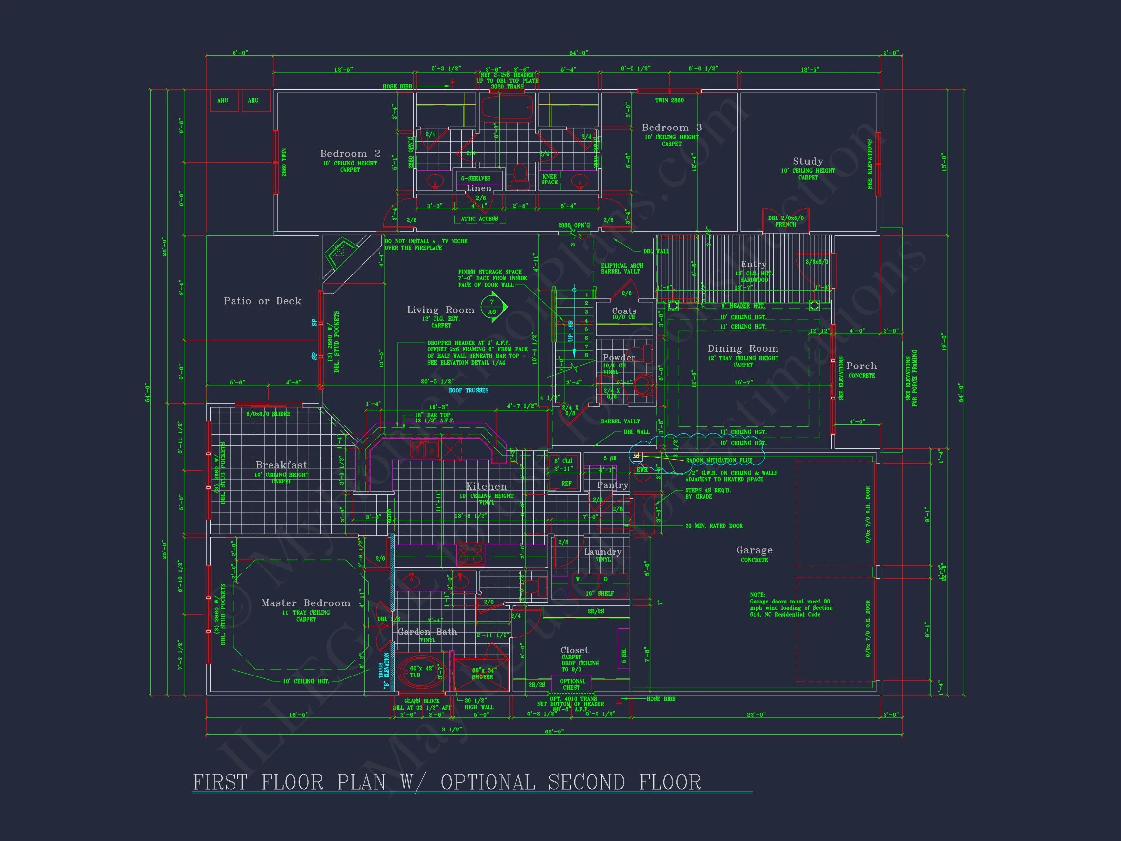 Discover this spacious 54' x 54' house plan with CAD blueprints, featuring 4 bedrooms, 3 baths, open floor plan, vaulted ceilings, and classic architectural designs.