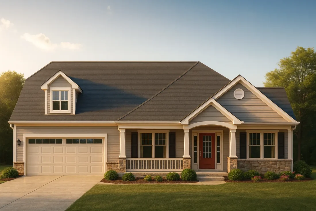 This blend of siding and stone creates an exterior that works equally well in suburban neighborhoods, rural landscapes, retirement communities, and family-oriented developments. Homeowners drawn to Classic Suburban and Craftsman Ranch styles often find this combination ideal because it offers charm without excessive ornamentation.