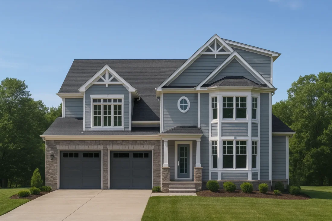 The exterior’s stone veneer base pairs with fiber-cement siding for timeless aesthetics and long-term durability. Architectural shingles, energy-efficient windows, and white trim emphasize craftsmanship and low maintenance.