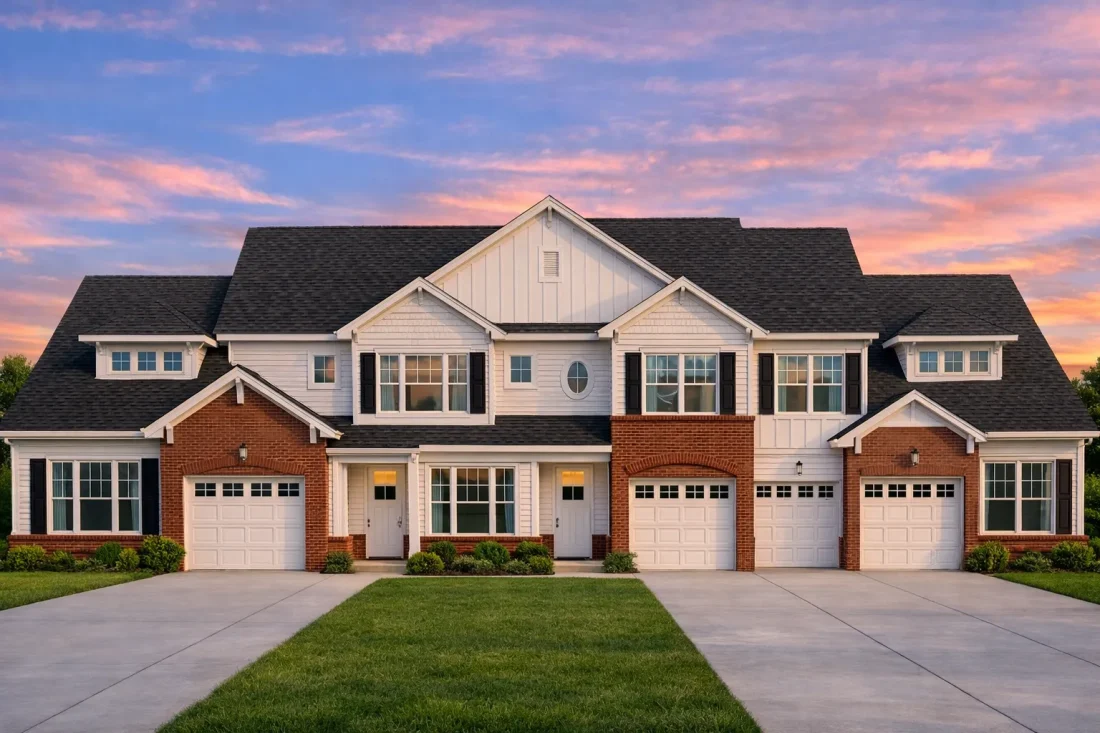 The design blends Traditional / Classic Suburban massing with recognizable New American detailing. This creates a warm, welcoming appearance while offering the efficiencies expected in contemporary townhome developments. The stone-and-siding combination maintains timeless appeal while aligning with today’s design standards.