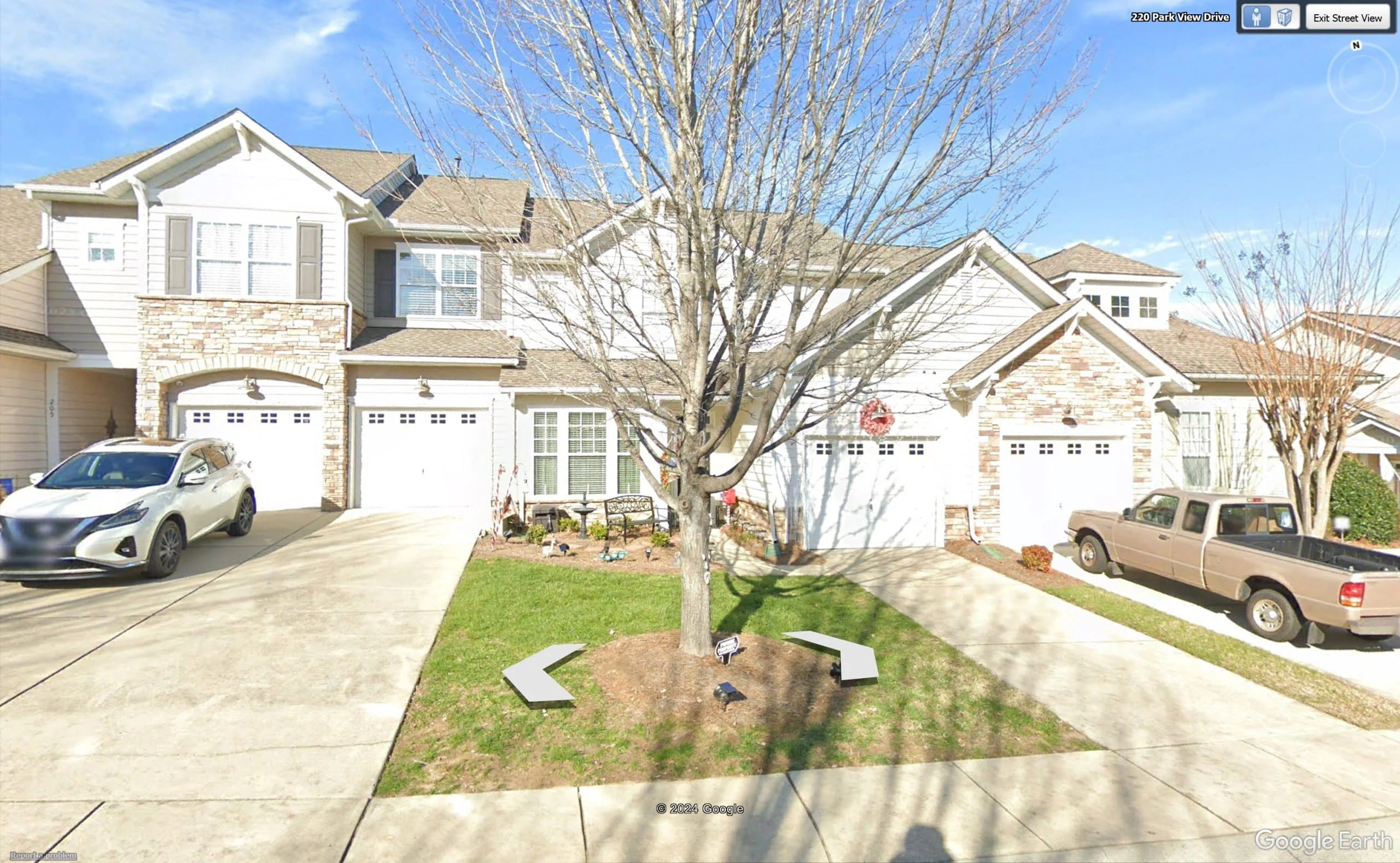 - Symmetrical triplex layout with stone-trimmed garage doors and coordinated rooflines.