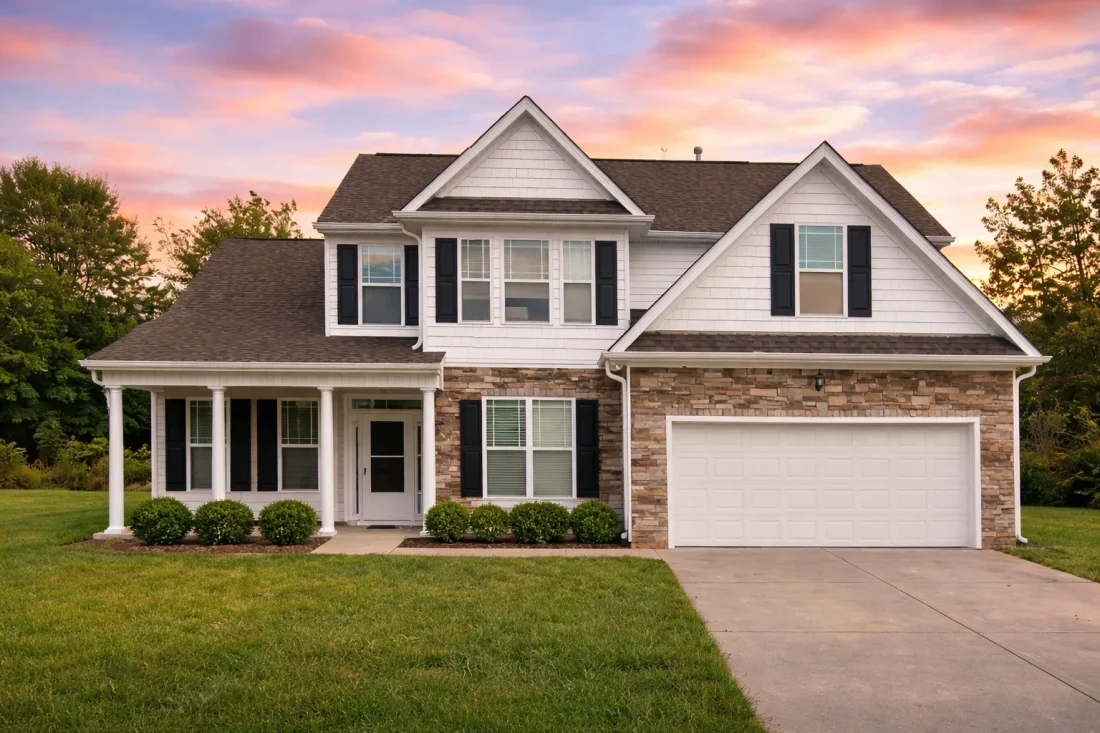 - Architectural shingle roof with classic gable detailing.