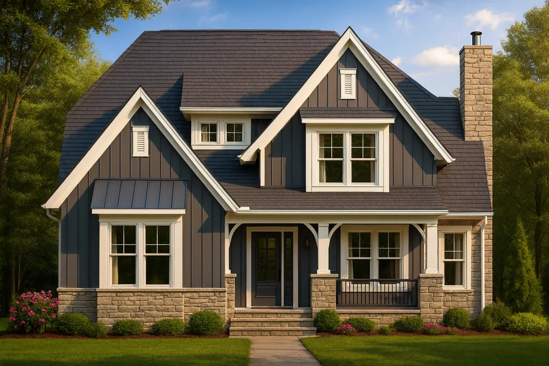 - Classic board and batten siding gives vertical texture and modern contrast.