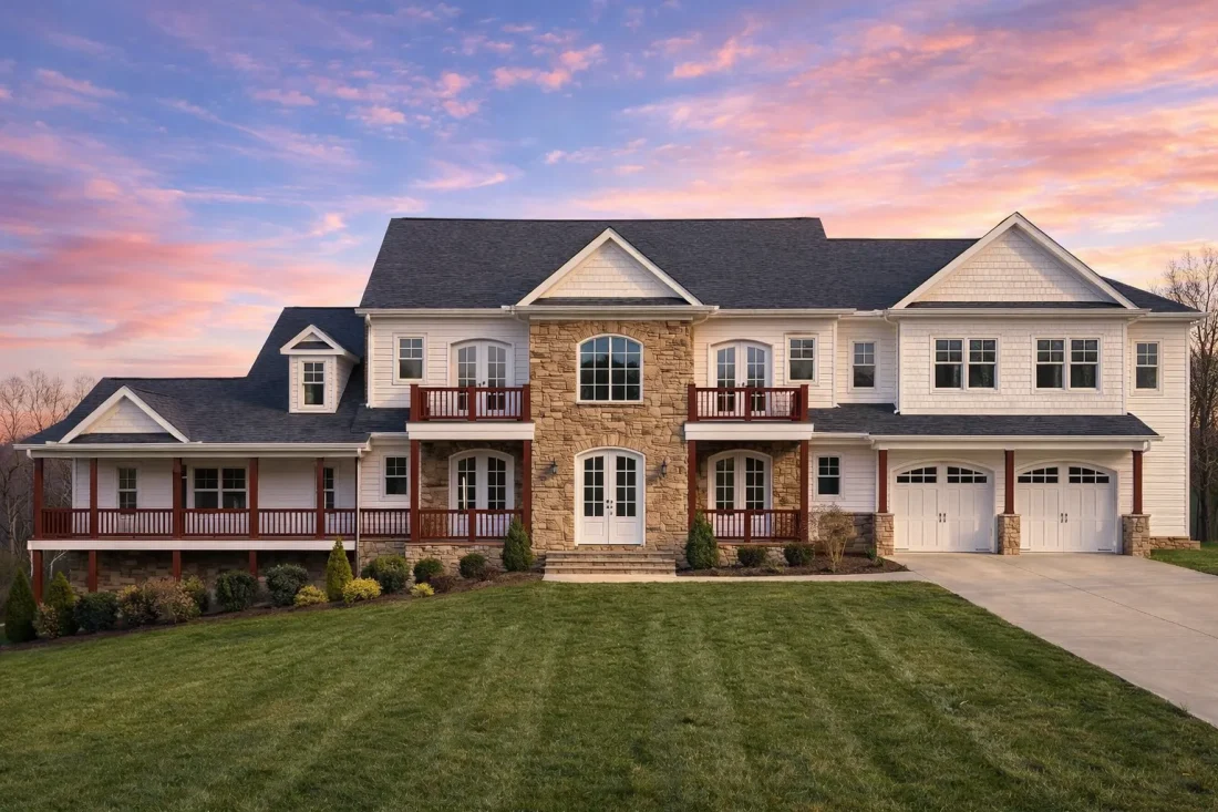 The exterior composition reflects hallmark characteristics of New American and Traditional / Classic Suburban architecture. A strong central entry, balanced window placement, and layered rooflines provide visual structure, while subtle Transitional detailing keeps the design current.